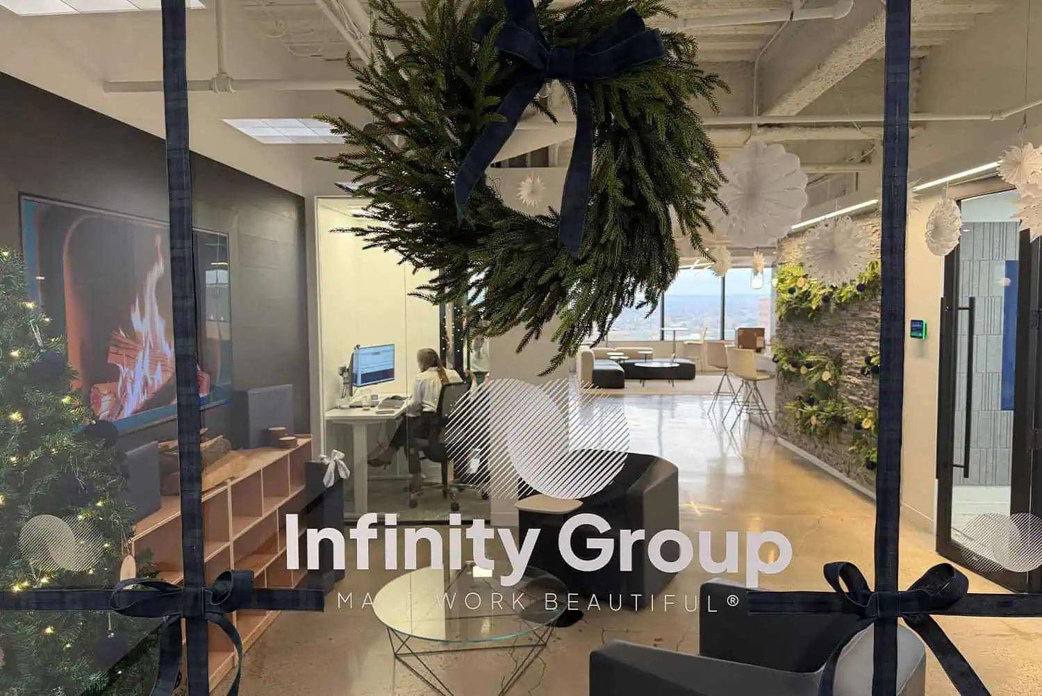 The holidays in the office should feel warm, welcoming, and connected. They shouldn’t feel expensive or overdone. Led by our Infinity Group Design team, our teams in both Hartford and Austin challenged ourselves to create a design-driven holiday look in each studio using simple materials, on-brand colors, and thoughtful styling. The result? Two beautifully festive studios transformed in one morning and for under $500.